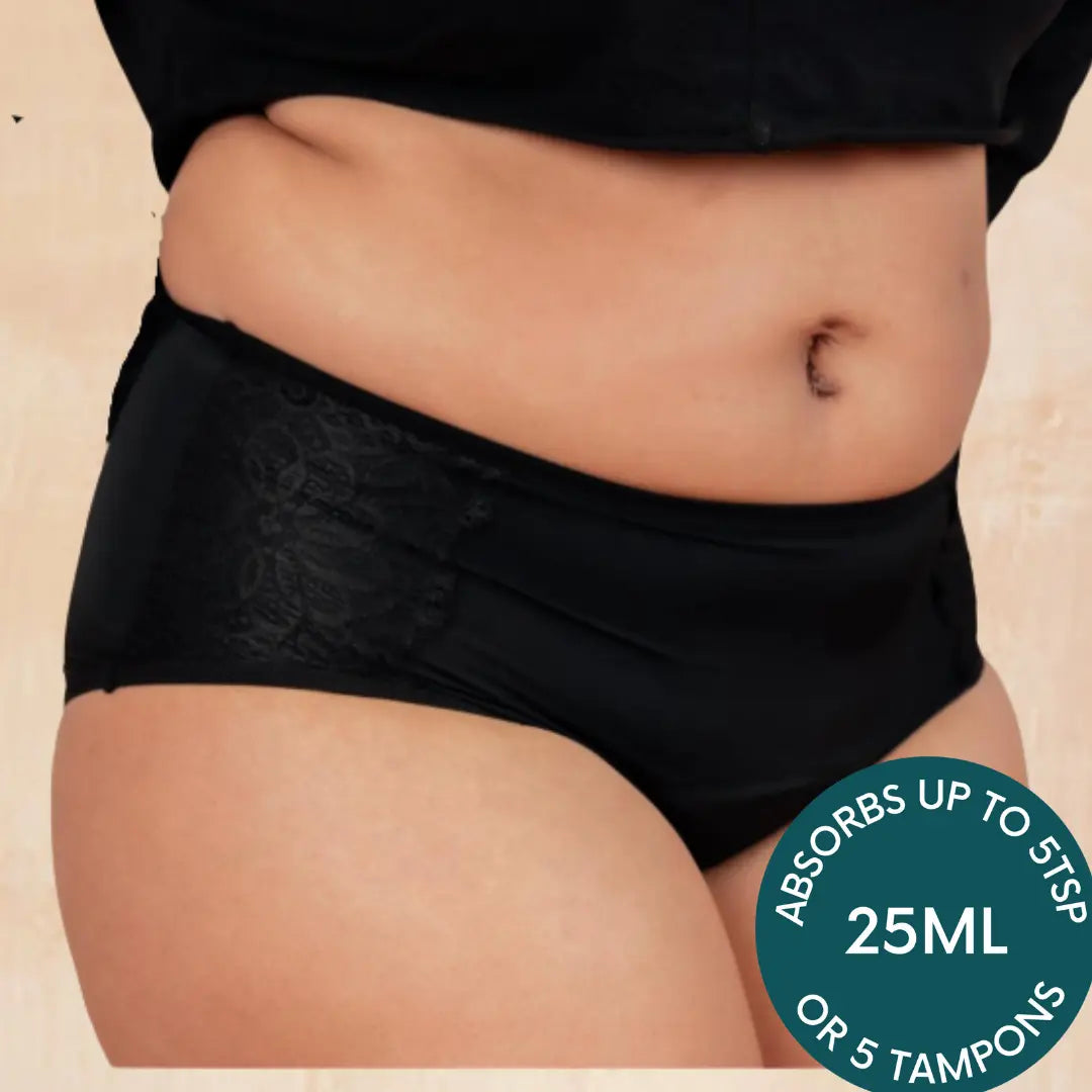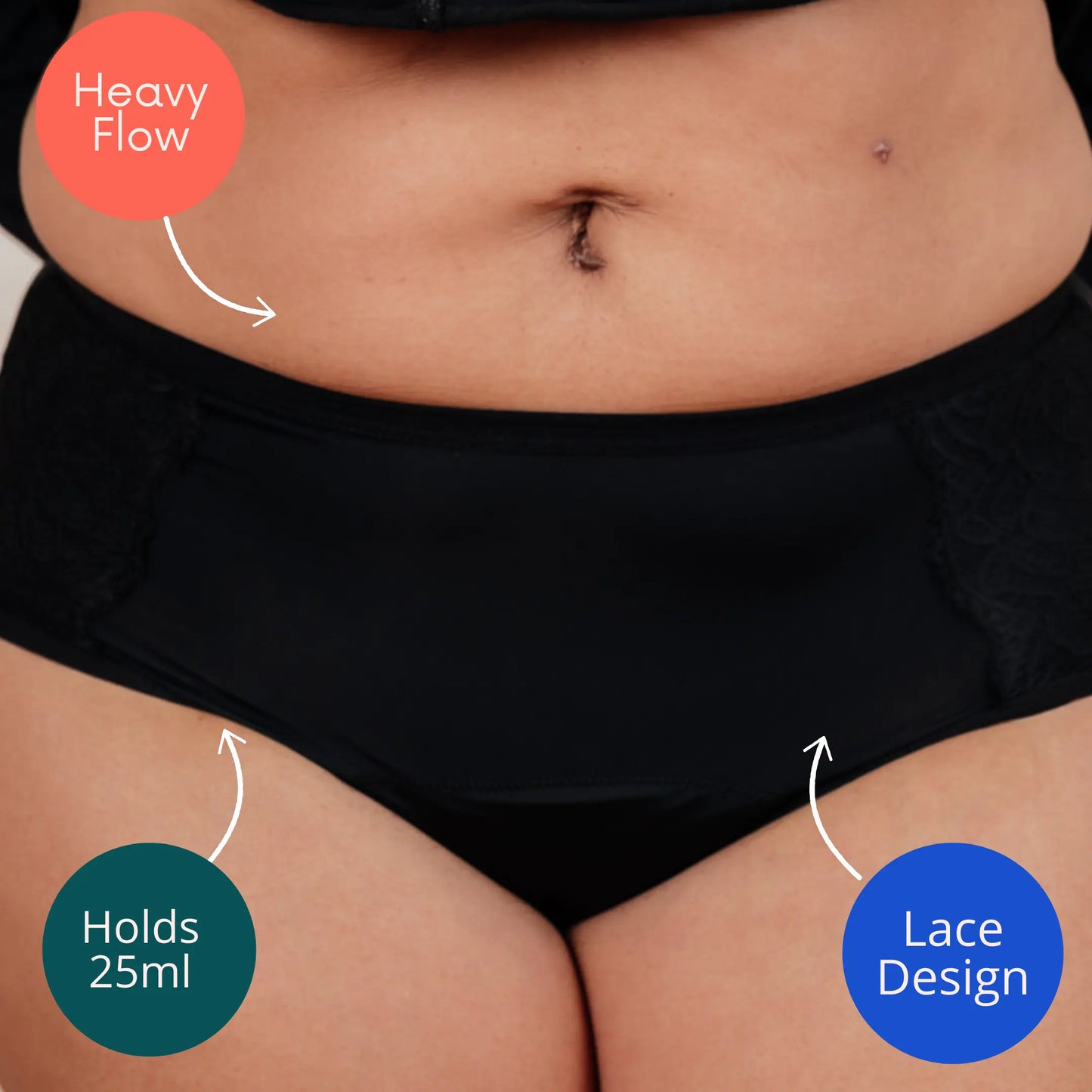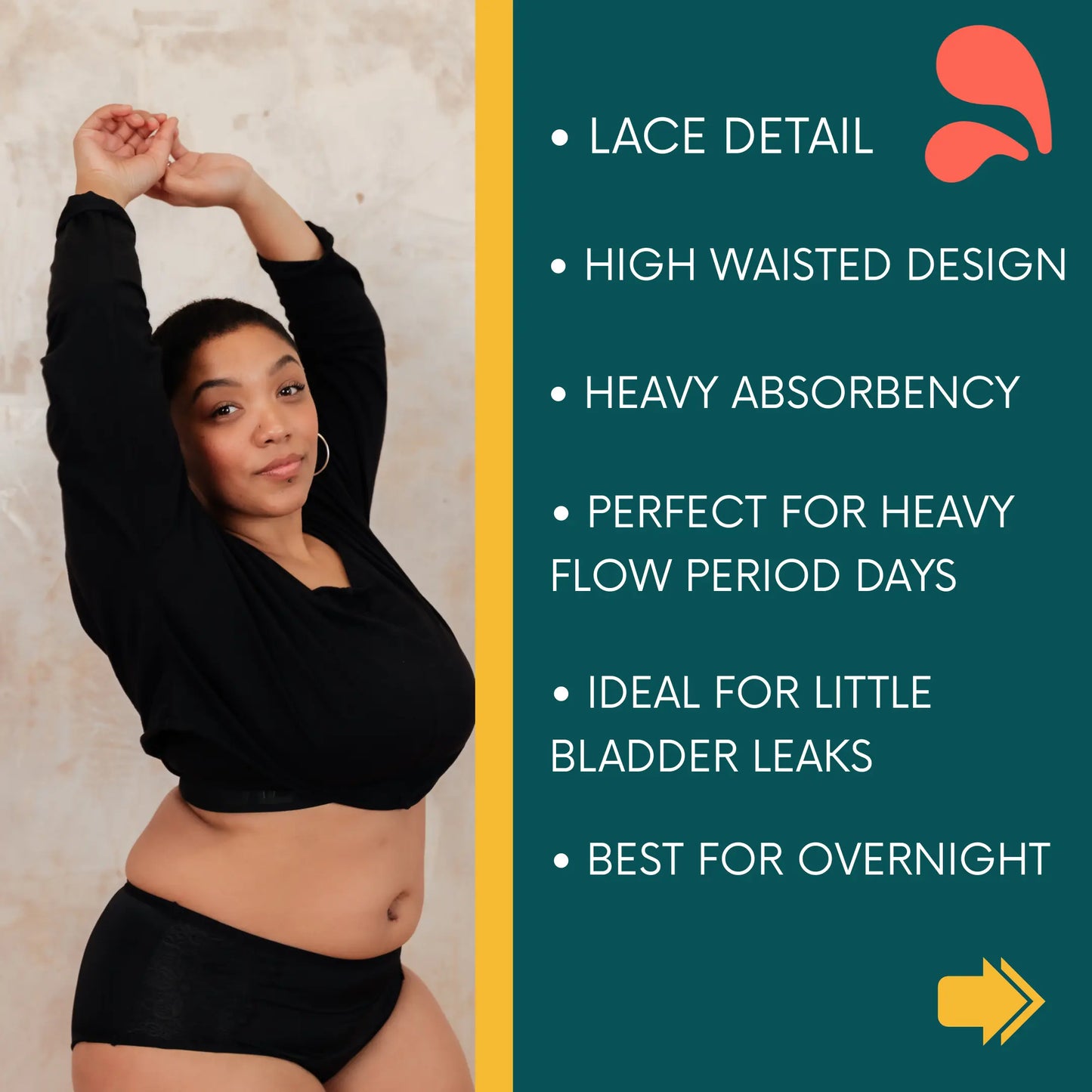 The Polly is designed for heavier periods and bladder leaks, combining super absorbent technology with beautiful lace details. With a high waist for comfort and a wider gusset for added protection, she’s your go-to style when you need extra peace of mind – especially at bedtime.
