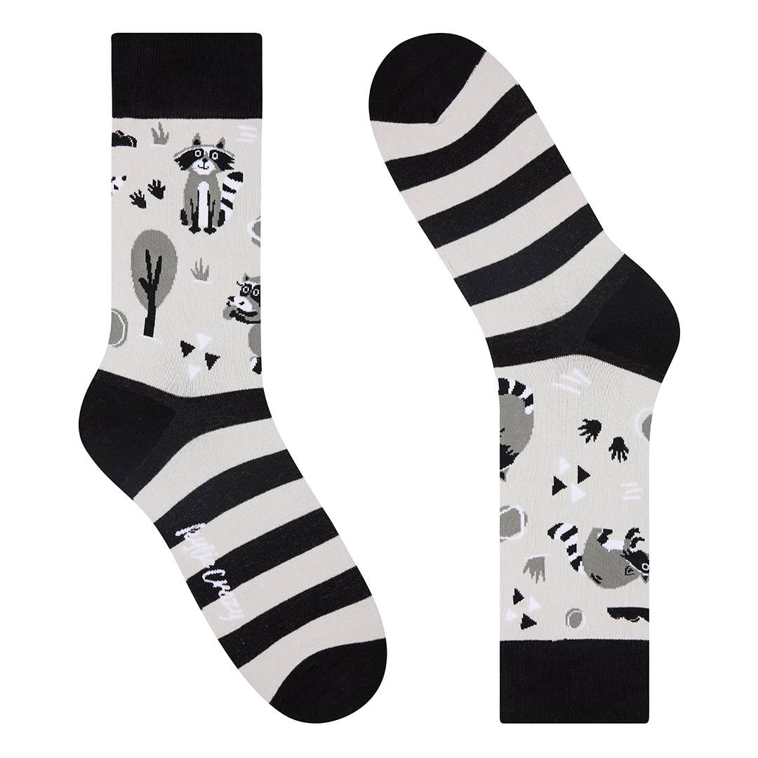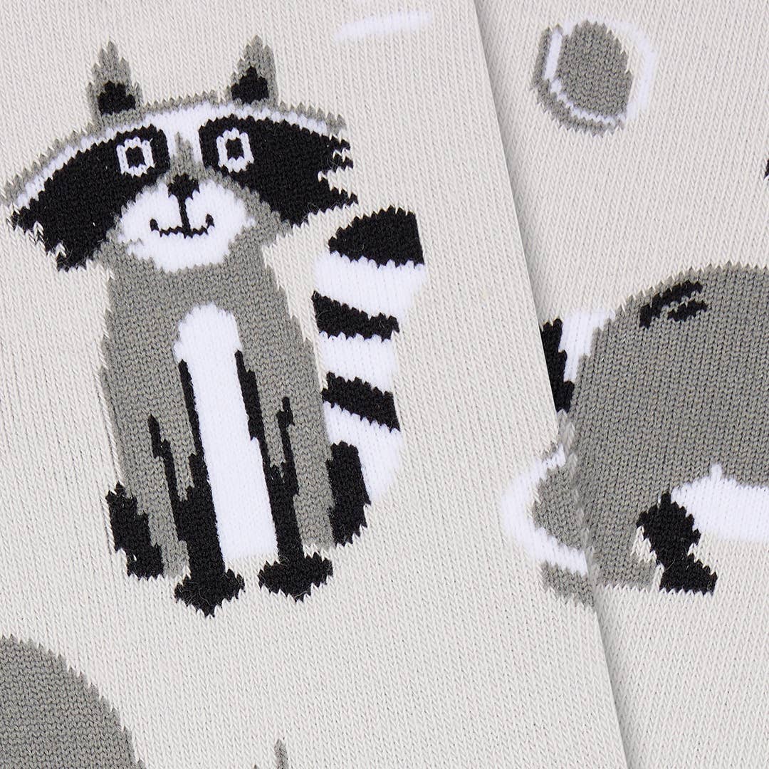 Black, white, and cute all over, our “Trash Panda Parade” socks celebrate the raccoon life in full cheeky glory. Featuring curious critters, forest vibes, and bold stripes, this pair is equal parts cosy and cunning. Perfect for nighttime snack raids or just stealing the style spotlight.