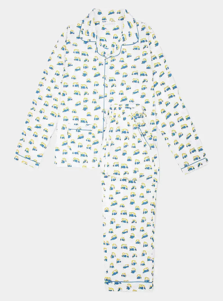 Fun and quirky hand-printed pyjamas featuring a playful blue and yellow tuk tuk block design. Made from 100% pure cotton, they are soft, breathable, and perfect for lounging or sleeping during the warmer months.