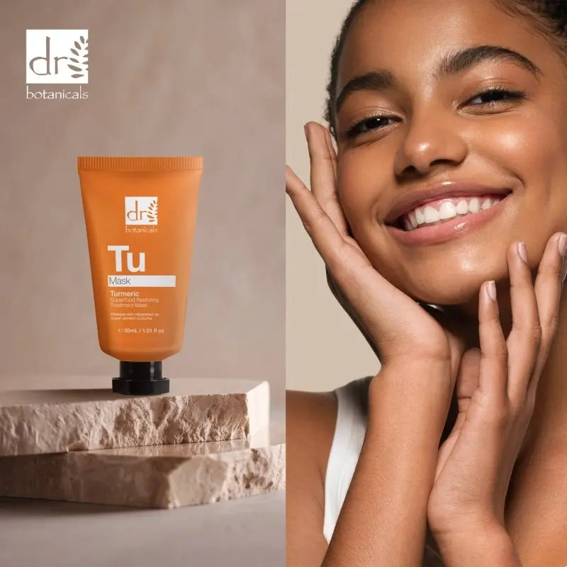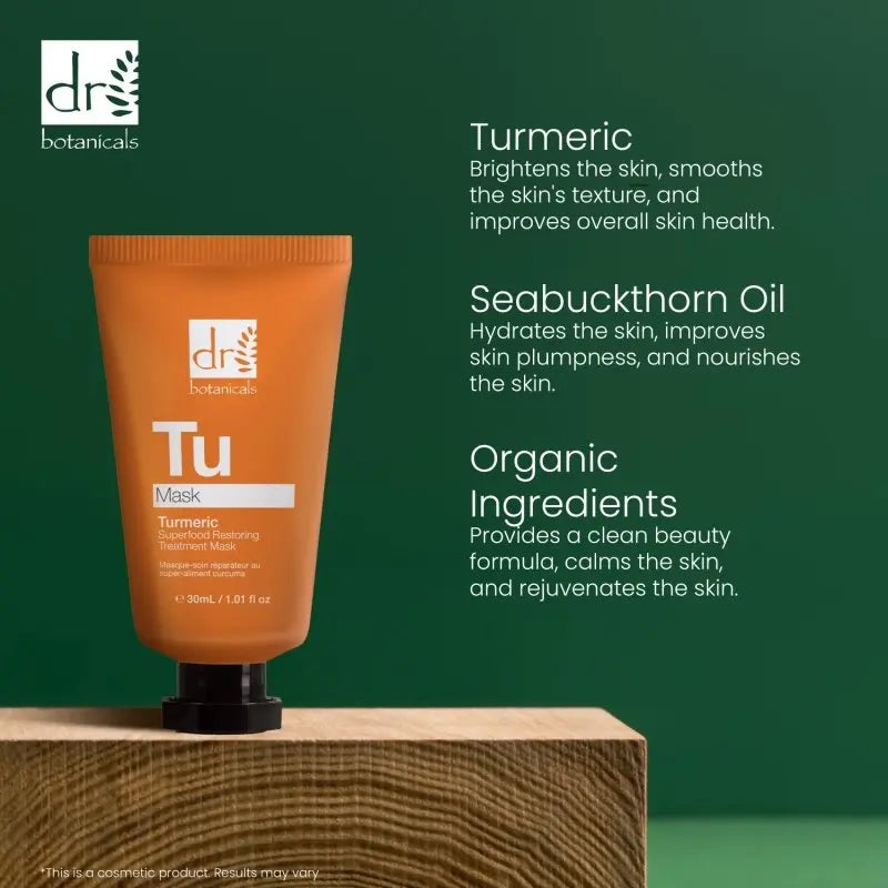 Dr Botanicals Turmeric Superfood Restoring Treatment Mask is a clean beauty formula that combines the power of turmeric root extract and seabuckthorn fruit oil to brighten, smooth, and hydrate the skin. With its organic ingredients and skin-nourishing properties, this mask helps to improve the skin's texture, plumpness, and overall health. Experience a calming and rejuvenating skincare routine with this natural and effective treatment.