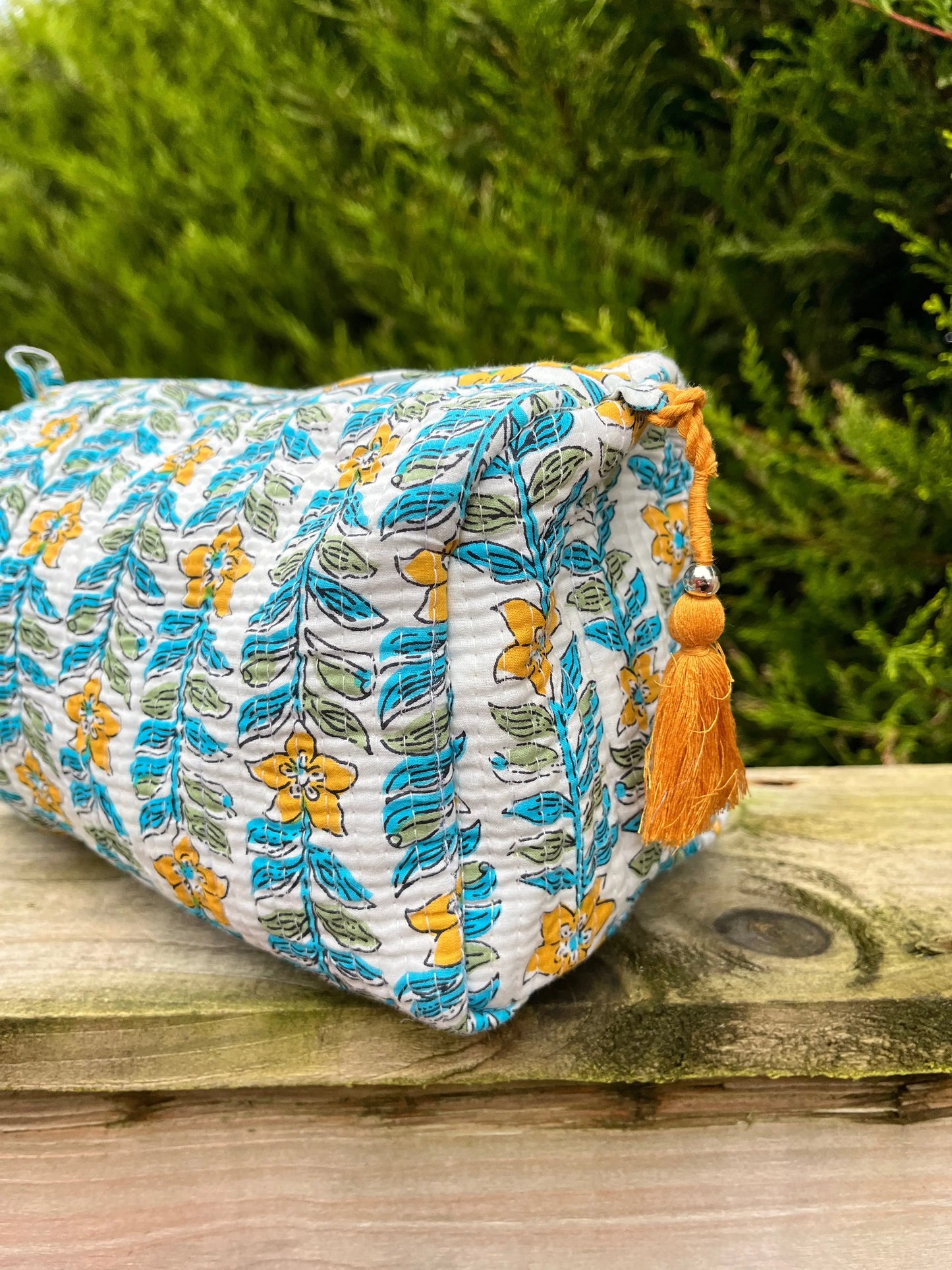 Introducing our exquisite Hand Block Printed Makeup Bag/Toiletry Bag – a versatile companion designed for both functionality and elegance. This charming bag is not only a place to stow your cosmetics but also boasts a waterproof lining, ensuring the safety of your essentials. To add a delightful touch, we've adorned it with a vibrant tassel, imparting a pop of colour and sophistication.