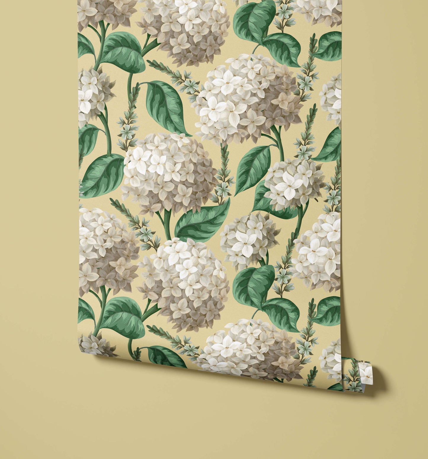 This bold hydrangea wallpaper is full of crisp detail, yet designed with a subtle watercolour effect. It's a modern design that features large white flowers with rich green foliage.