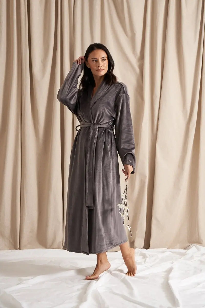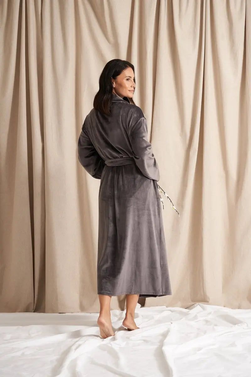 Wrap yourself in luxury with our Velour Longline Robe, meticulously crafted from the softest velour fabric for unparalleled comfort. This full-length robe features indulgent full-length sleeves, an internal waist tie, and an external waist tie, providing added security while lounging. Perfectly combining elegance and comfort, this robe is designed to elevate your relaxation experience. Pair it effortlessly with our bestselling Bamboo Lace collections, including the new Teal shade for Autumn/Winter, for a stylish ensemble that exudes sophistication. Embrace the season with the Velour Longline Robe and experience the epitome of luxurious loungewear.