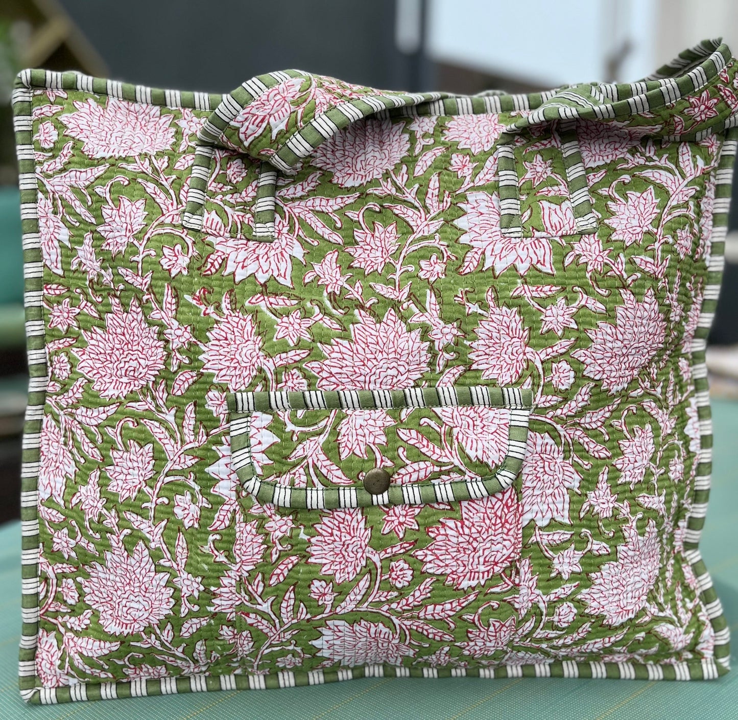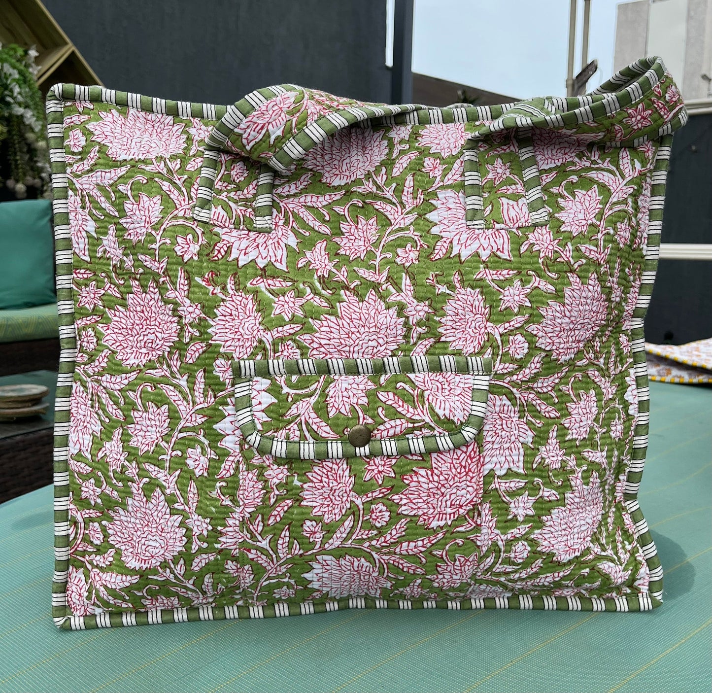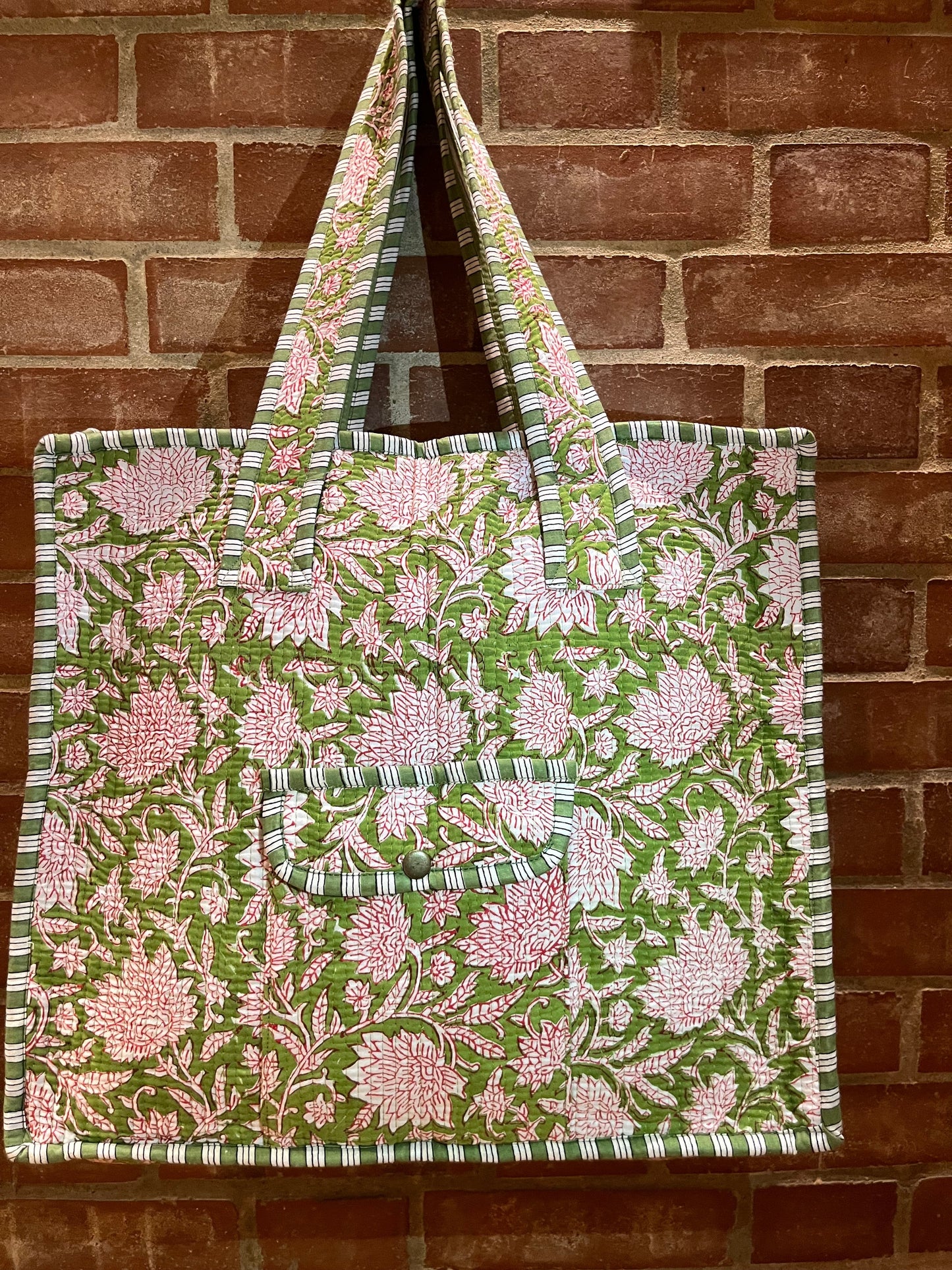 Our block-printed, quilted tote bag is a stylish, eco-friendly essential made from soft, durable cotton fabric. Handcrafted with traditional Indian block prints, this tote combines trendy design with everyday functionality, making it perfect for any occasion. With a spacious interior and sturdy quilted structure, it’s your go-to for all your needs.
