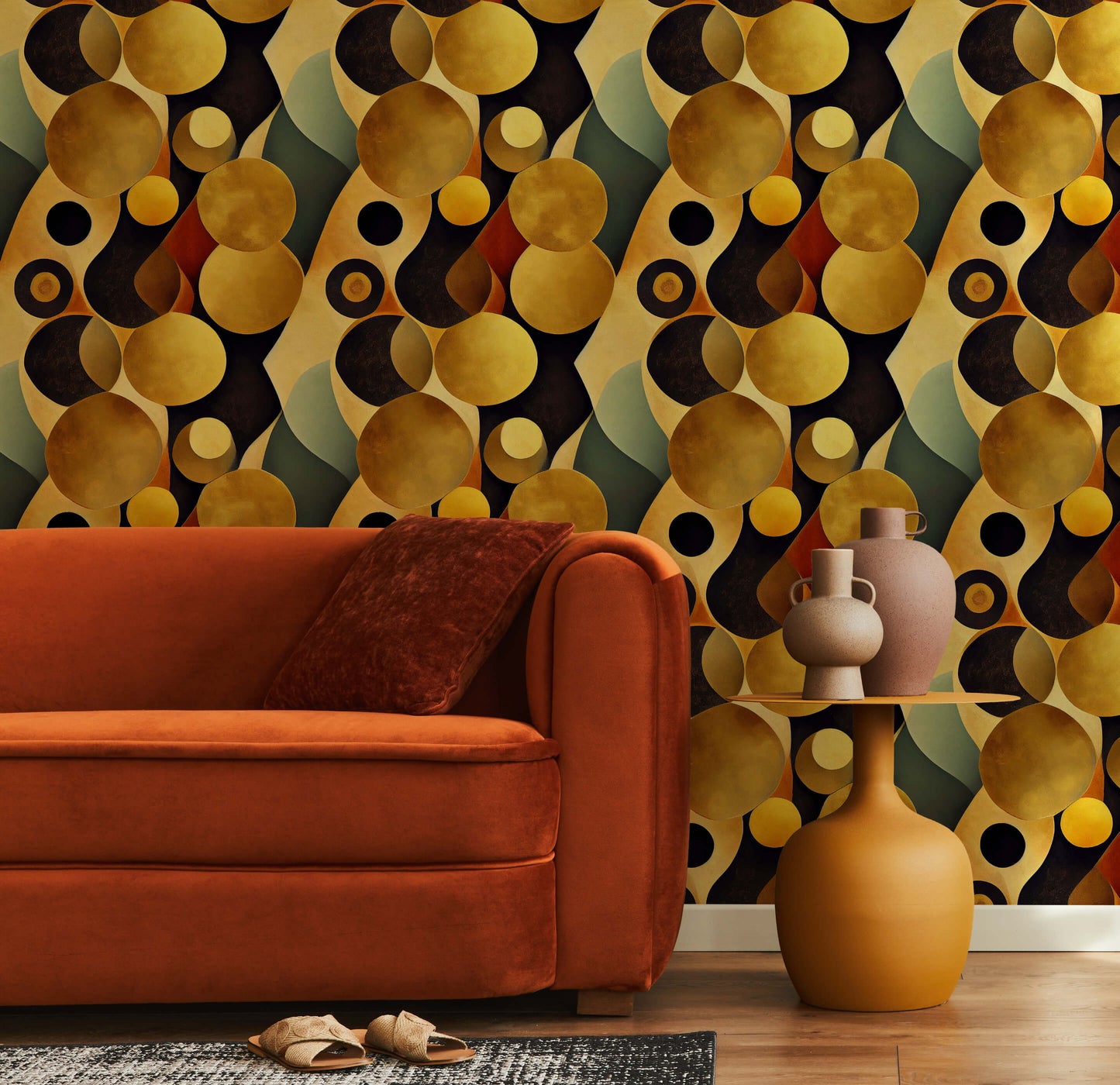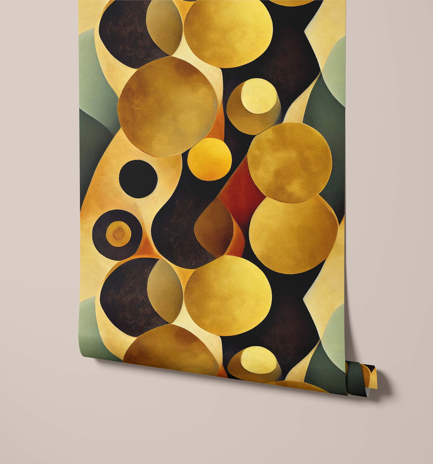 This colourful abstract wallpaper is inspired by the style of Gustav Klimt. He is known for his ornate, decorative style, which was characterised by the use of gold leaf, intricate patterns and symbolism. This Art Nouveau style delivers bold yellow tones and an interesting 3d effect.