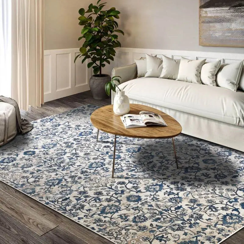 Designed to be easy to care for, its soft surface maintains a fresh and inviting look with minimal effort. The elegant floral pattern in subtle cream and blue tones brings a classic yet fresh feel to any space, blending seamlessly with both traditional and contemporary interiors.