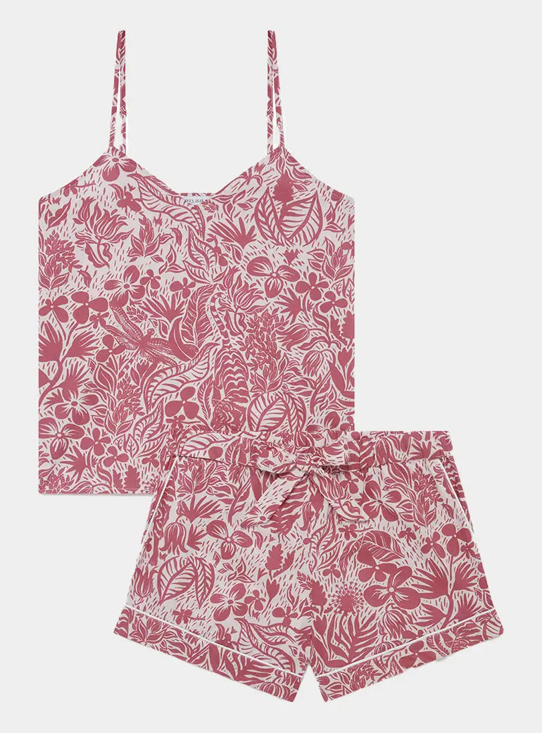 Cut for a relaxed fit, our Viva Oasis Cami Top and Shorts Set will brighten your nights and mornings with its all-over lively print. Crafted from breathable 100% GOTS-certified organic cotton, this set features luxury French seams and piped trims for a sophisticated finish. The V-neck cami top has fully adjustable shoulder straps, ensuring a perfect fit, while the matching shorts come with handy slip pockets at the sides and a drawstring elasticated waistband with fabric self-tie for added comfort.