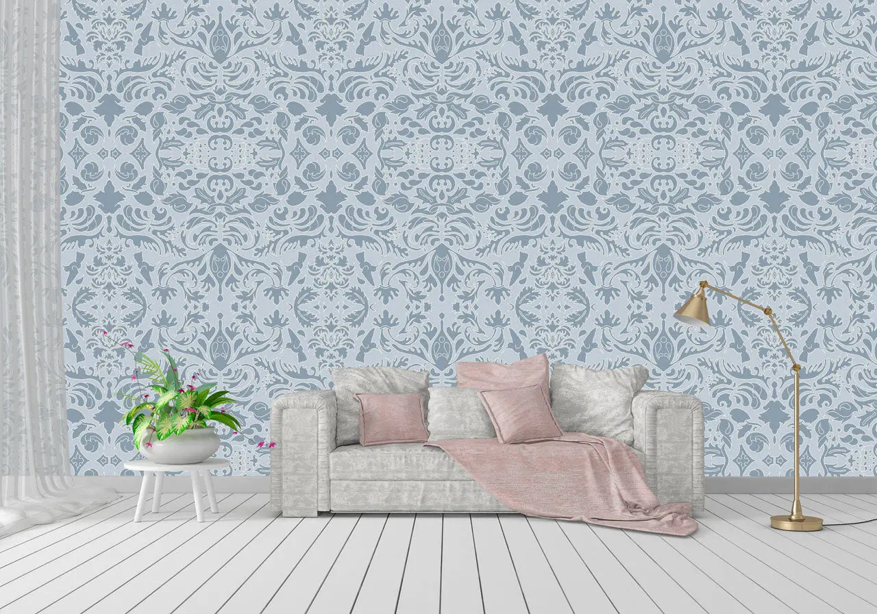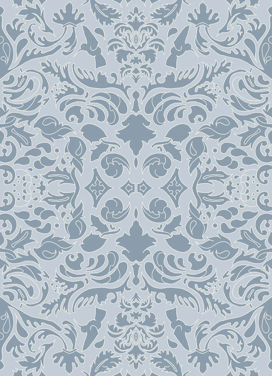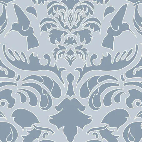 Repeat Patten Wallpaper: Hummingbird Damask Blue and Pale Blue.