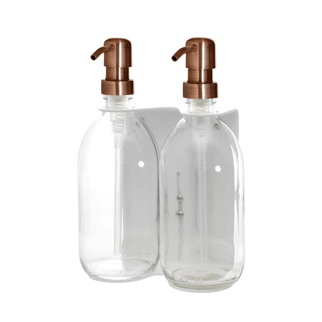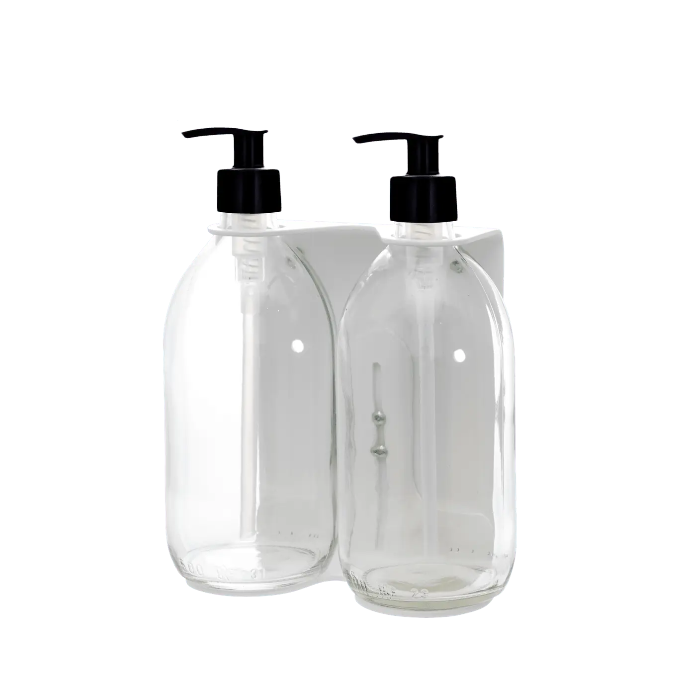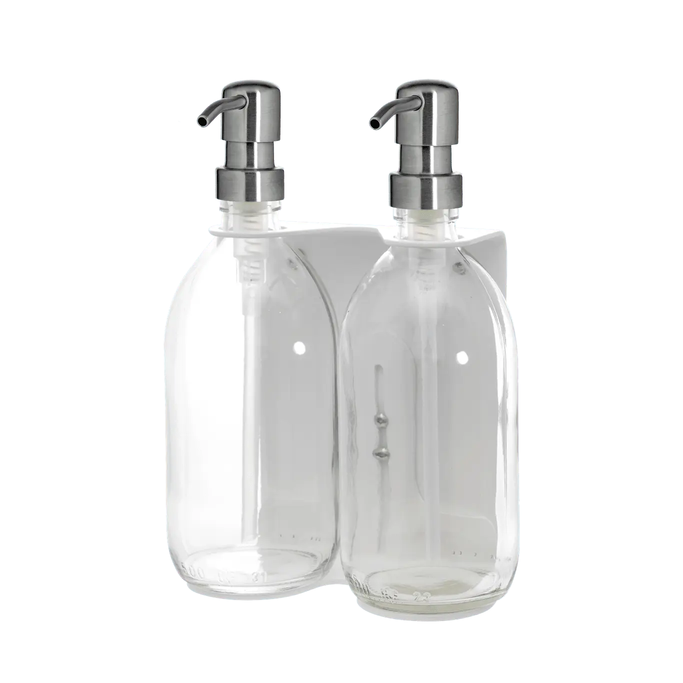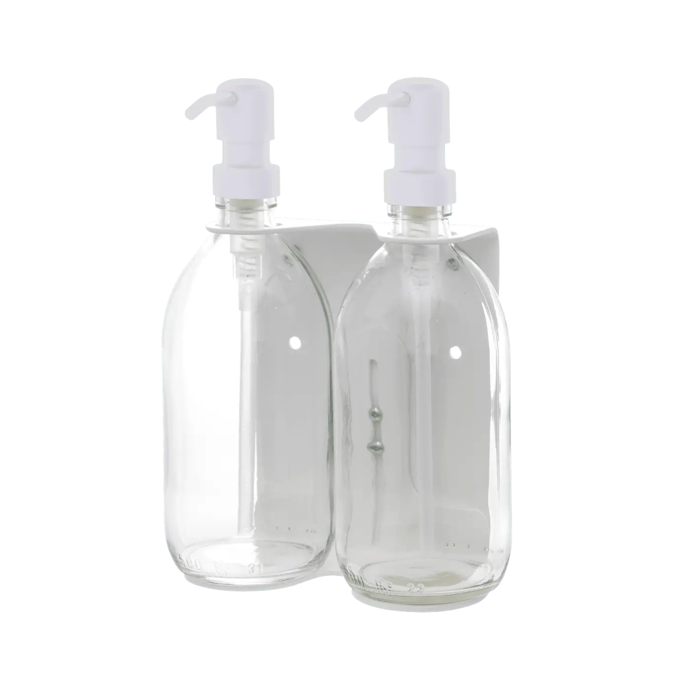 Always within reach, this white wall-mounted soap dispenser holder with refillable glass bottles is perfect for saving space and creating a clean, modern aesthetic in any bathroom or space.