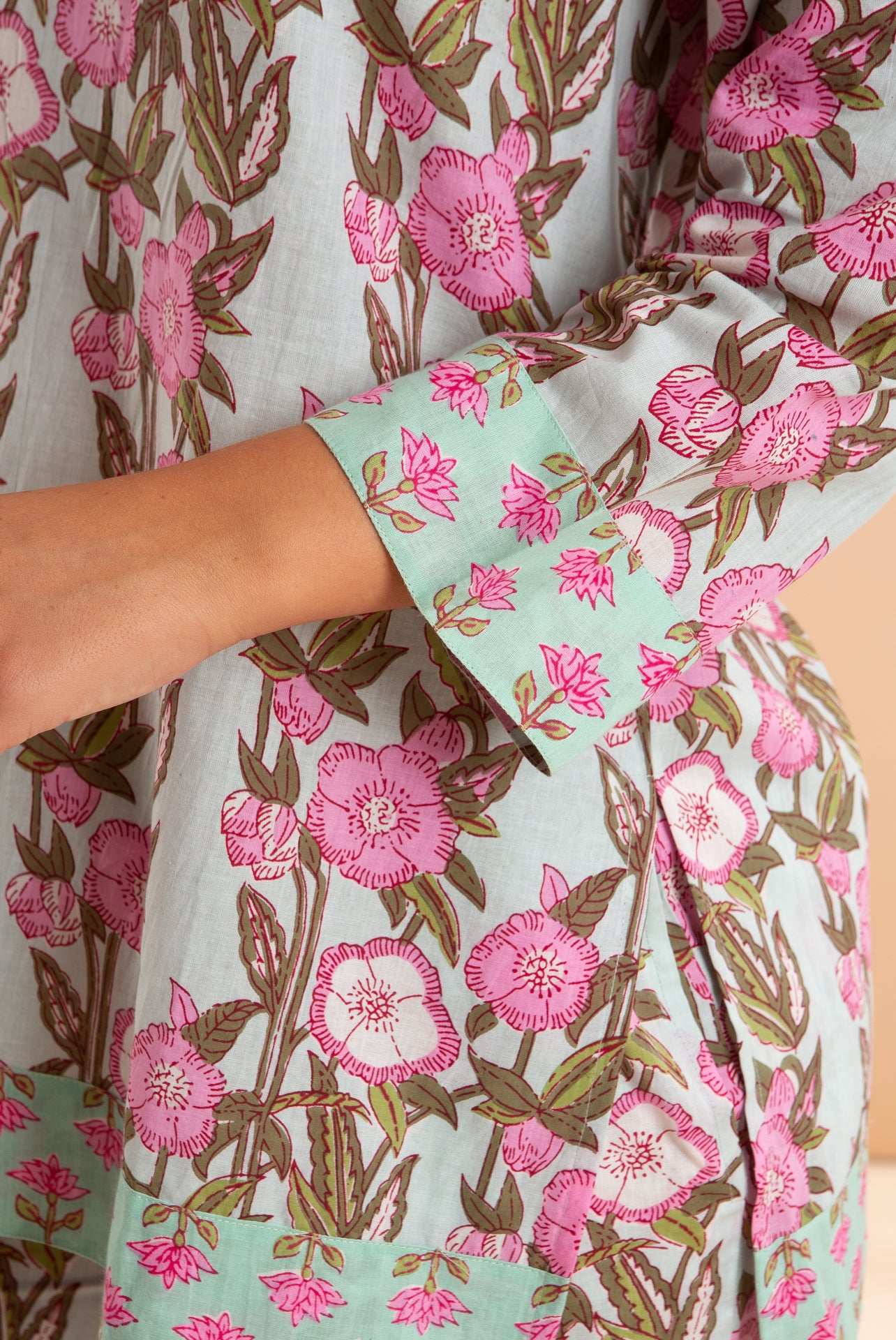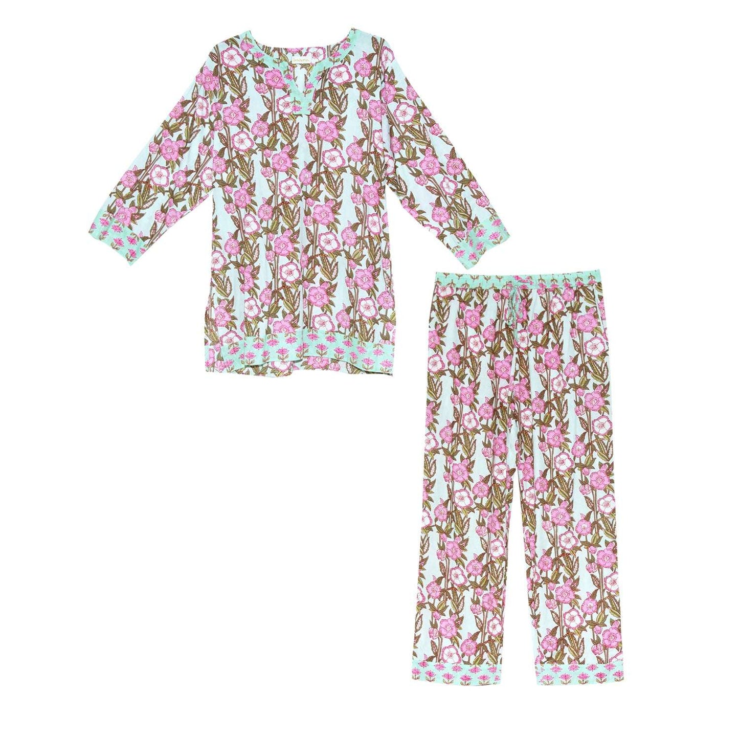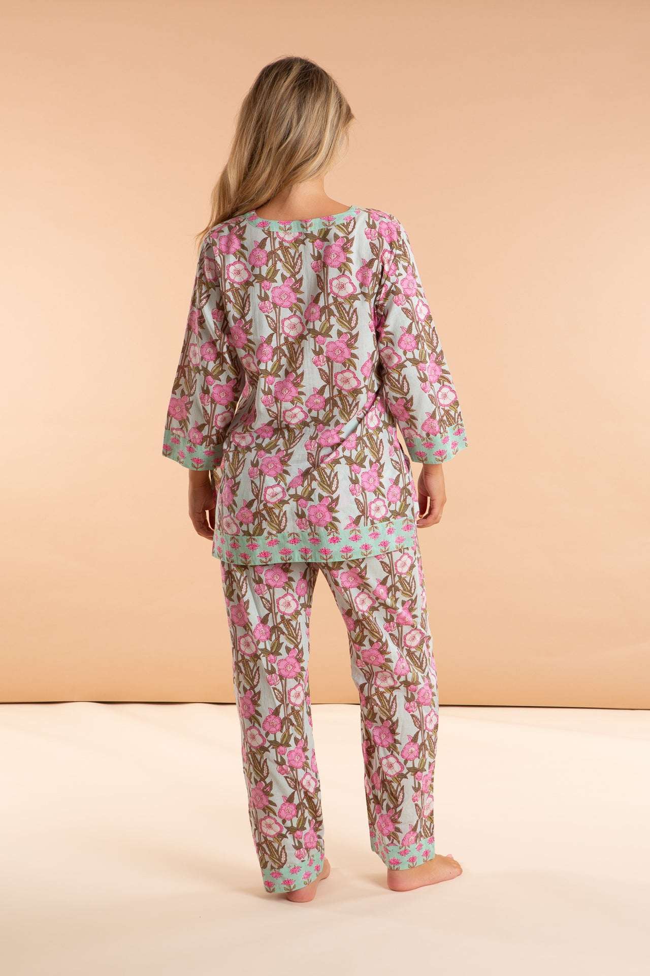 Our Wild Rose women's cotton pyjamas are inspired by the resilient spirit of untamed roses growing freely in nature. These luxury pjs feature a 3/4-sleeve and a beautiful floral contrast neckline and hem print. The straight leg pyjama bottoms have ideally placed side pockets. Our 100% Indian cotton is carefully printed and pre-washed, making it the perfect comfortable outfit for both your early nights and late mornings.
