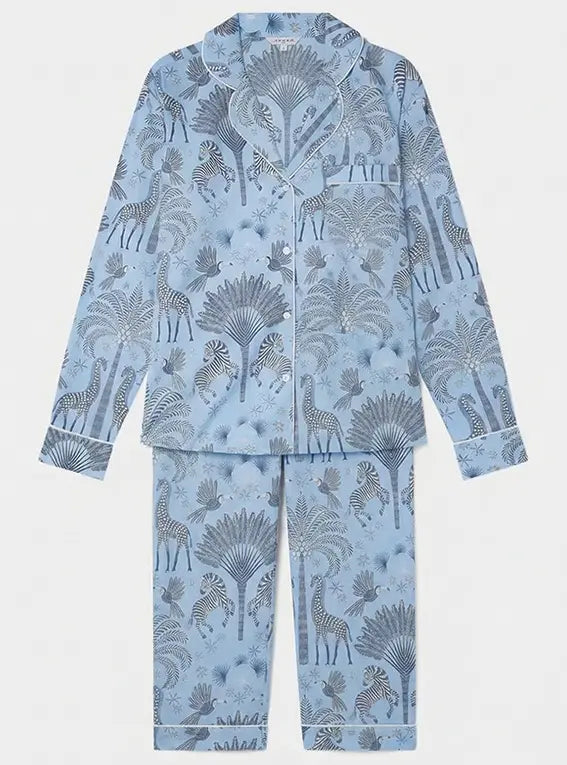 This Favourite Travels pyjama set brings a vibrant all-over print to your nights and mornings, combining both classic and contemporary elements. Designed for a relaxed yet tailored fit, this set is accented with contrast piped trims for a refined look. The bottoms feature convenient slip pockets at the sides and a drawstring elasticated waistband with a fabric self-tie for added comfort and adjustability.