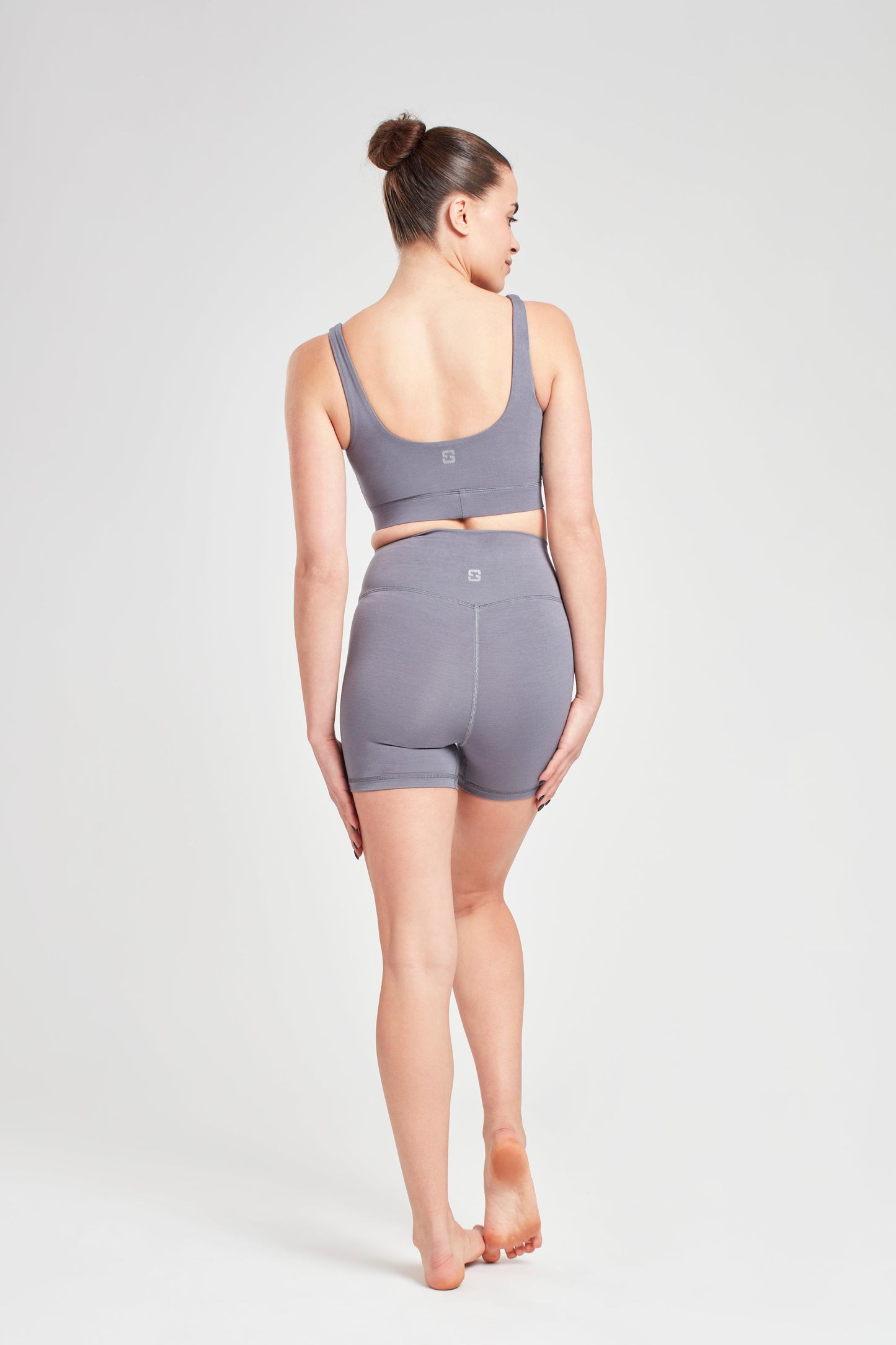 Sōma Wrap Biker Shorts. Silver. High performance fabric. High waisted. Comfortable. Stylish. Comfortable feel for loungewear. Well suited to yoga and Pilates.