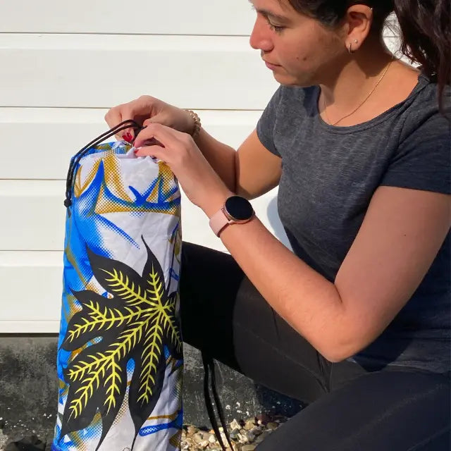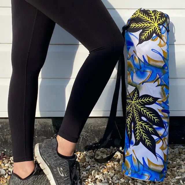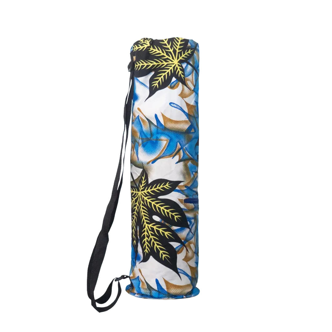 This stunning yoga bag is handmade in Madagascar using modern African wax fabric and cotton. Thoughtfully designed with an adjustable handle and a practical front zip pocket, it blends functionality with vibrant artistry.