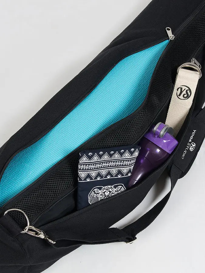Soft yet rugged, this cotton canvas bag is packed with features to help organise yourself for yoga class. Its numerous zippered compartments can keep your phone and iPod secure, its adjustable padded shoulder strap makes this bag easy and comfortable to carry. Features a mesh top panel for ventilation and a reinforced woven handle.