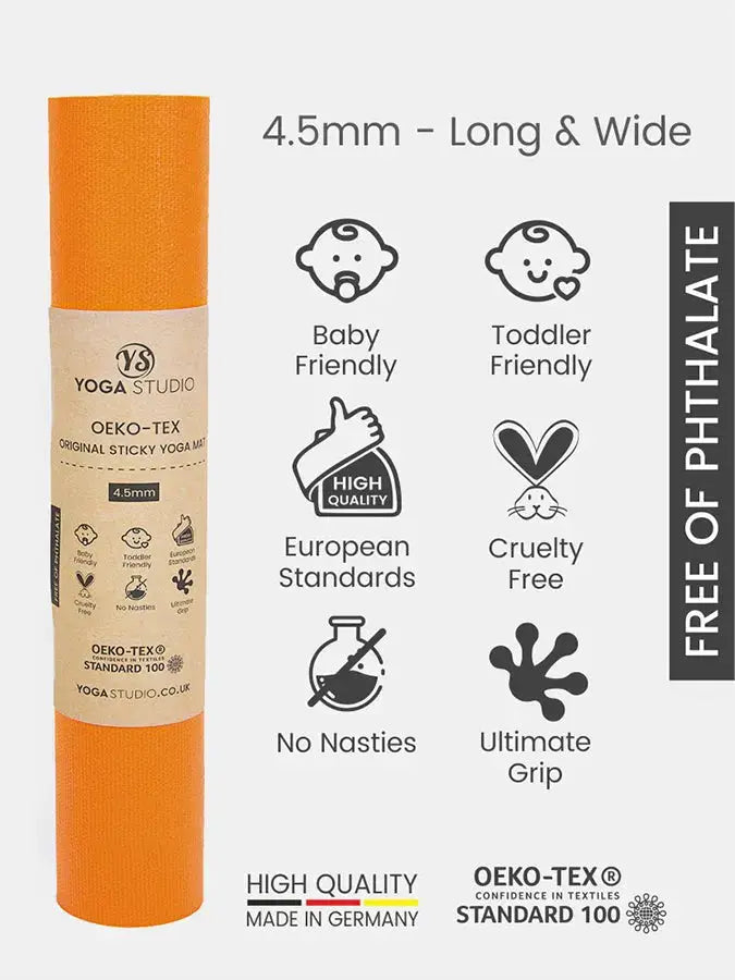 The Yoga Studio Oeko-Tex® Original Sticky Yoga Mat is proudly made in Germany, ensuring higher quality and a denser, more durable material. Certified to Oeko-Tex® Standard 100 – Class 1 (Baby Standard), this mat meets the highest safety standards available, making it suitable for everyone — from babies to advanced yogis.