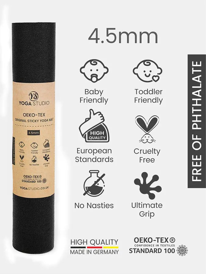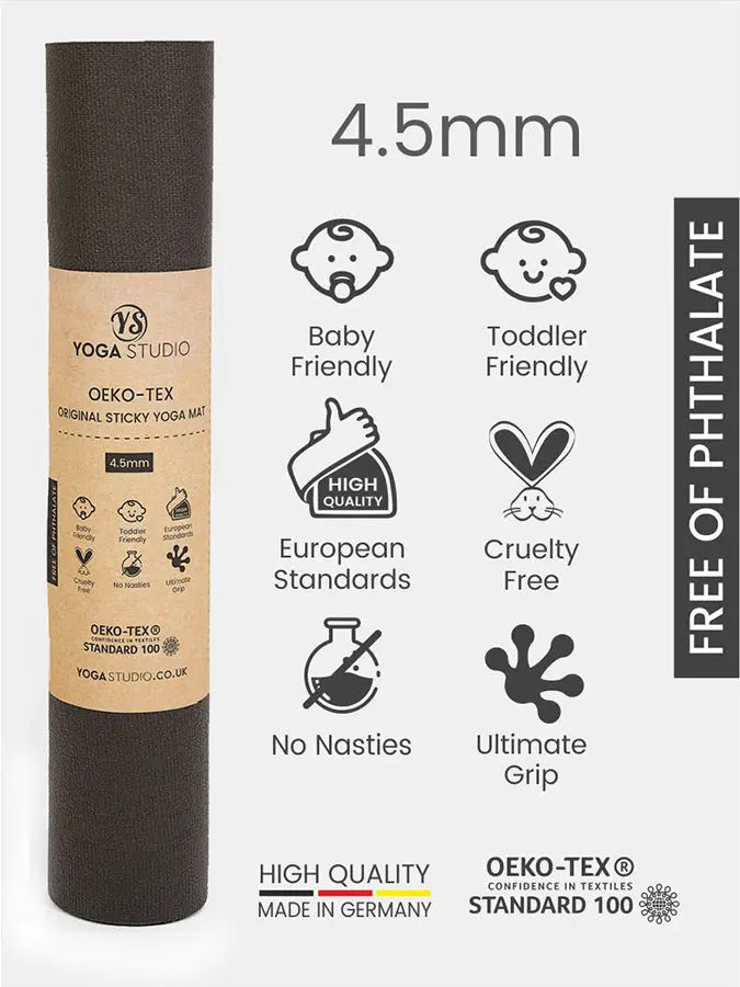 The Yoga Studio Oeko Tex Original Sticky Yoga Mats Made in Germany, Meaning Higher Quality, Denser Material. Our Oeko Tex Original Sticky Yoga Mats Have Class 1, Baby Standard, Which Is The Highest Standard Available.