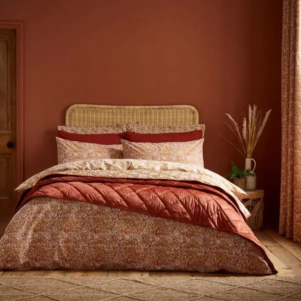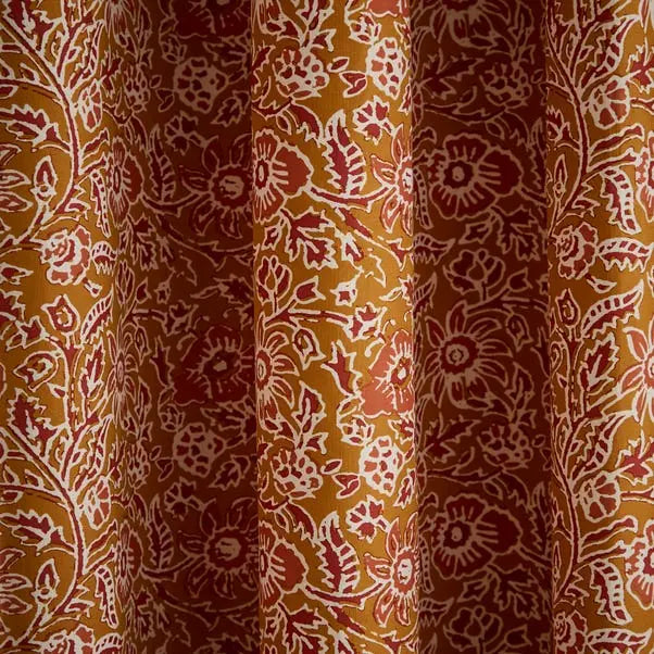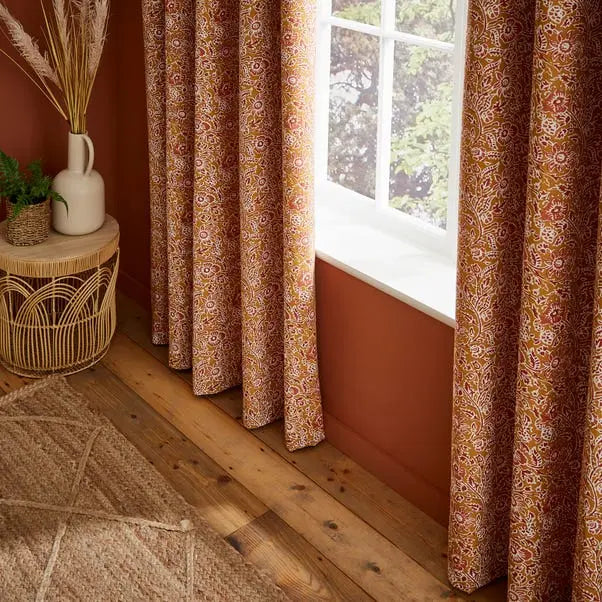 Make a bold statement with our Ziara Curtains, where retro florals meet modern functionality. Featuring a vibrant amber and gold pattern, this luxurious pair is made from breathable, 100% cotton fabric for a beautiful drape and long-lasting durability. A microfibre blackout lining ensures excellent light reduction, helping you create a serene and private atmosphere in any room.