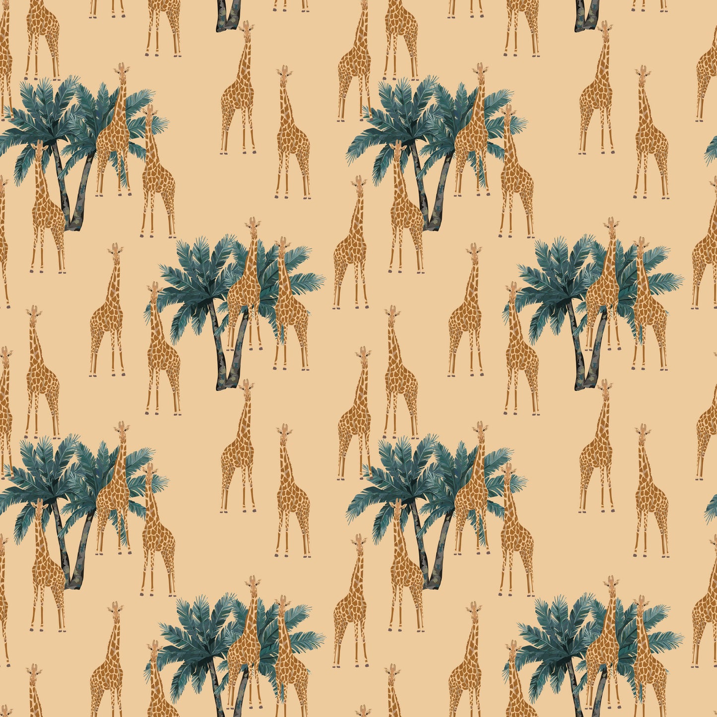 Our exotic giraffe pattern wallpaper offers an adventurous feel to your room, showcasing a repeating design of illustrated giraffes and palm trees. With a colour palette of warm desert tones, this design offers a stylish touch to your space, making it ideal for bedrooms, living spaces or home office.